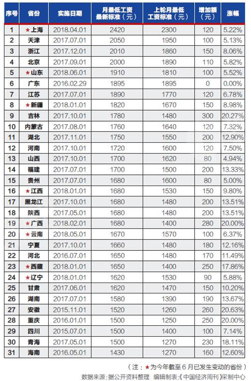 據(jù)記者不完全統(tǒng)計(jì),截至6月6日,全國(guó)已有山東、上海、新疆、遼寧、江西、西藏、廣西和云南等8個(gè)省區(qū)市上調(diào)了2018年最低工資標(biāo)準(zhǔn)。自2016年以來,已有29個(gè)省份上調(diào)了最低工資標(biāo)準(zhǔn),至今未調(diào)整的是四川省和安徽省。不過,這兩個(gè)省也已經(jīng)明確表示今年將提高最低工資標(biāo)準(zhǔn),如果順利實(shí)施,意味著今年上調(diào)最低工資標(biāo)準(zhǔn)的地方已經(jīng)擴(kuò)容至10省市。