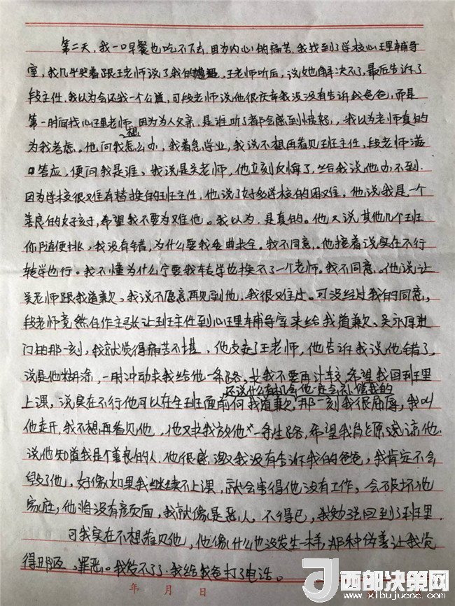 孩子的病情一直不見好轉(zhuǎn),主治醫(yī)生和心理輔導(dǎo)老師都說(shuō)要打開孩子的心結(jié),而孩子的心結(jié)就在學(xué)校一直沒(méi)有給她一個(gè)公正的說(shuō)法。在斷斷續(xù)續(xù)上學(xué)過(guò)程中,他多次找過(guò)學(xué)校。起初學(xué)校還和他談,后來(lái)學(xué)校說(shuō)他們是組織教學(xué)的地方,處理教師的事管不了,要找教育局,直接就不理他了。再后來(lái)他連門都進(jìn)不去了。