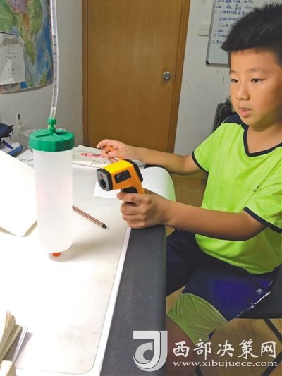 首先設計一個裝置,下部寬大的容器盛水,上部細長的管子可以觀察水的體積變化。然后將裝滿水的容器放入冰箱冷凍層,形成冰水混合物,此時水溫接近零攝氏度。最后將容器取出,用手持式測溫儀測量水溫……這一系列步驟,不是實驗室里進行的專業(yè)研究,而是南京師范大學附屬小學四年級學生徐子越和王美澄正在做的暑假作業(yè),他們通過觀察水的體積隨溫度的變化,來解釋冰為什么會浮在水面上。