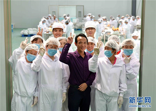 黃玉仁(前排中)在寧夏固原市隆德縣寧夏黃土地農(nóng)業(yè)食品有限公司與當(dāng)?shù)貑T工合影(8月29日攝)。來(lái)自福建莆田的黃玉仁2017年在隆德縣創(chuàng)辦寧夏黃土地農(nóng)業(yè)食品有限公司,利用當(dāng)?shù)伛R鈴薯種植優(yōu)勢(shì),制作馬鈴薯深加工產(chǎn)品,促進(jìn)當(dāng)?shù)伛R鈴薯銷售和農(nóng)民增收。目前公司已建成4條生產(chǎn)線,為當(dāng)?shù)?0多名百姓解決就業(yè)。 新華社記者郭緒雷攝