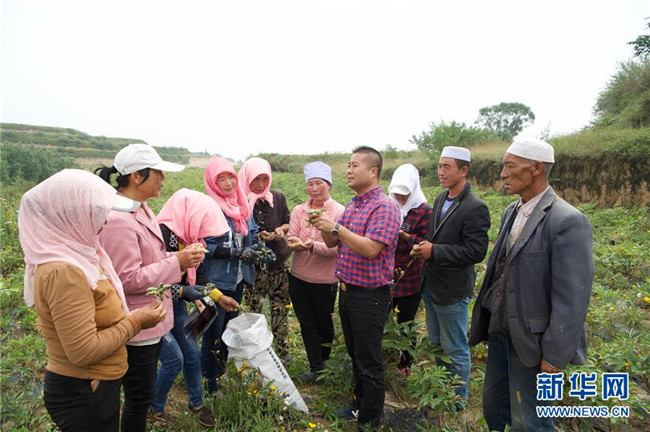 來(lái)自福建長(zhǎng)樂(lè)的林錦云(右四)在固原市河川鄉(xiāng)向農(nóng)戶講解采摘注意事項(xiàng)(8月28日攝)。2014年,林錦云通過(guò)土地流轉(zhuǎn)方式,承包了河川鄉(xiāng)1.5萬(wàn)畝荒山,打造油用牡丹生產(chǎn)基地。目前,林錦云種下的7600畝油用牡丹已經(jīng)開(kāi)始產(chǎn)生效益,公司已就近吸納村民300多人就業(yè),其中建檔立卡戶39戶,人均年收入2萬(wàn)多元。 新華社記者姜克紅攝