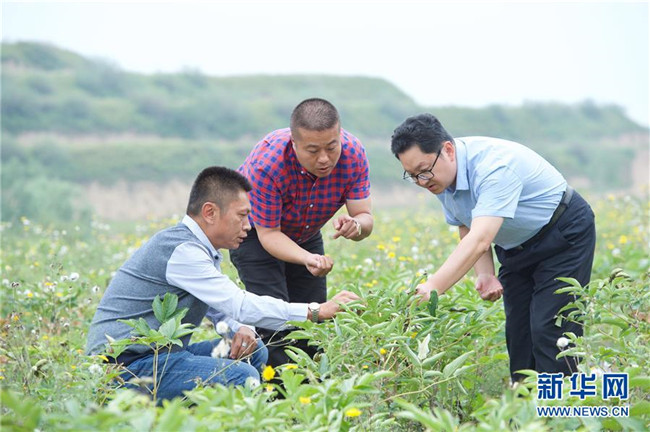 來(lái)自福建長(zhǎng)樂(lè)的林錦云(中)在寧夏固原市河川鄉(xiāng)與福建對(duì)口支援農(nóng)業(yè)專家(右)交流牡丹生長(zhǎng)情況(8月28日攝)。2014年,林錦云通過(guò)土地流轉(zhuǎn)方式,承包了河川鄉(xiāng)1.5萬(wàn)畝荒山,打造油用牡丹生產(chǎn)基地。目前,林錦云種下的7600畝油用牡丹已經(jīng)開(kāi)始產(chǎn)生效益,公司就近吸納村民300多人就業(yè),其中建檔立卡戶39戶,人均年收入2萬(wàn)多元。 新華社記者王鵬攝