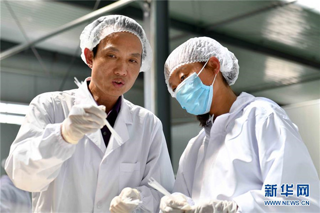 黃玉仁(左)在寧夏固原市隆德縣寧夏黃土地農(nóng)業(yè)食品有限公司與員工交流馬鈴薯粉絲制作技術(shù)(8月29日攝)。來(lái)自福建莆田的黃玉仁2017年在隆德縣創(chuàng)辦寧夏黃土地農(nóng)業(yè)食品有限公司,利用當(dāng)?shù)伛R鈴薯種植優(yōu)勢(shì),制作馬鈴薯深加工產(chǎn)品,促進(jìn)當(dāng)?shù)伛R鈴薯銷售和農(nóng)民增收。目前公司已建成4條生產(chǎn)線,為當(dāng)?shù)?0多名百姓解決就業(yè)。 新華社記者郭緒雷攝