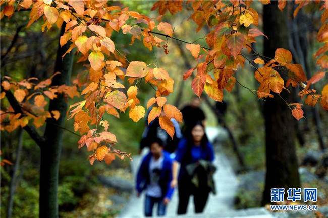 10月6日,游客在位于太行山東麓的靈壽縣五岳寨自然風(fēng)景區(qū)內(nèi)觀賞紅葉。新華社發(fā)(陳其保 攝)
