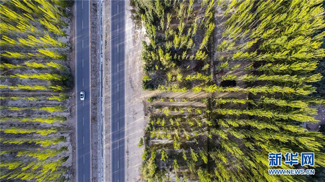車(chē)輛行駛在新疆阿克蘇地區(qū)柯柯牙綠化工程核心區(qū)(9月20日無(wú)人機(jī)拍攝)。新華社記者 胡虎虎 攝