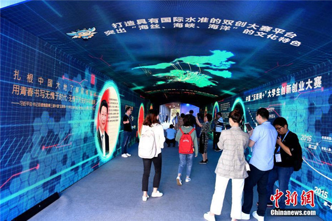 10月13日,第四屆中國(guó)“互聯(lián)網(wǎng)+”大學(xué)生創(chuàng)新創(chuàng)業(yè)大賽總決賽在廈門(mén)大學(xué)舉行。本屆大賽于今年3月份啟動(dòng),迄今累計(jì)已有近265萬(wàn)大學(xué)生、63萬(wàn)個(gè)團(tuán)隊(duì)參賽,涌現(xiàn)出一大批科技含量高、市場(chǎng)潛力大、社會(huì)效益好的高質(zhì)量項(xiàng)目,以“90后”為主的創(chuàng)新創(chuàng)業(yè)生力軍已全面發(fā)力,釋放出“青年+創(chuàng)新創(chuàng)業(yè)”的無(wú)窮力量。圖為創(chuàng)新隧道亮相廈大校園。中新社記者 王東明 攝
