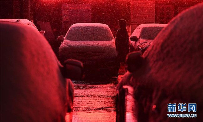 在青海省西寧市,一名市民冒雪前行(11月3日攝)。 11月3日,青海省西寧市等地迎來降雪。 新華社記者 吳剛 攝