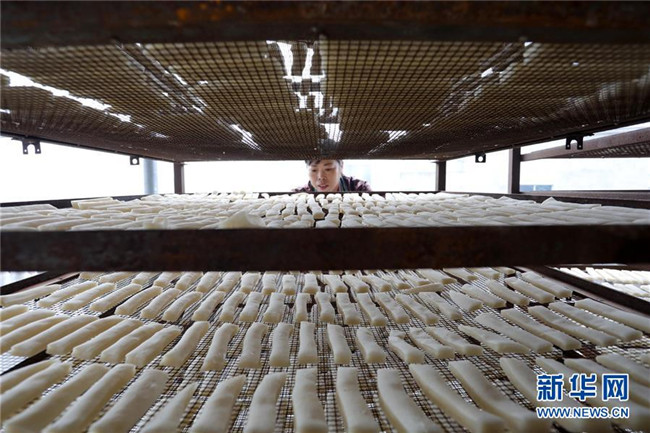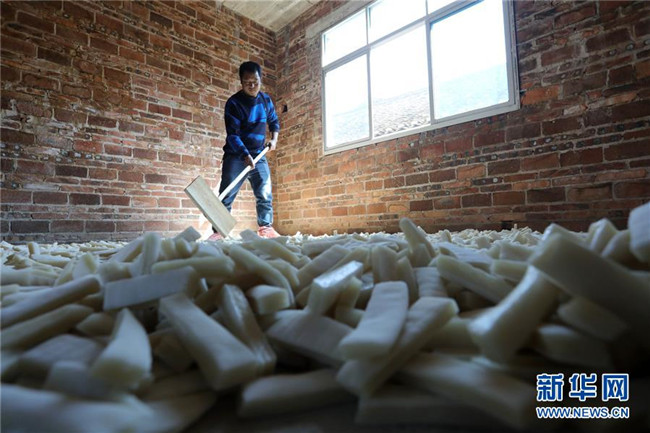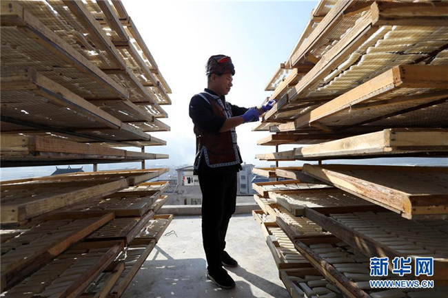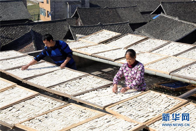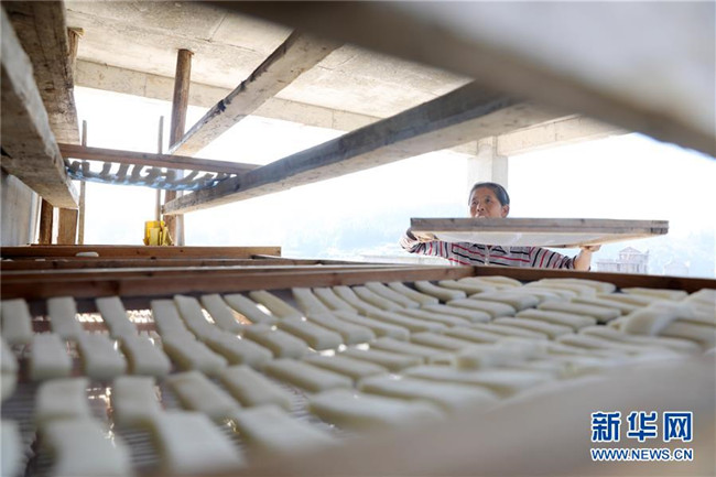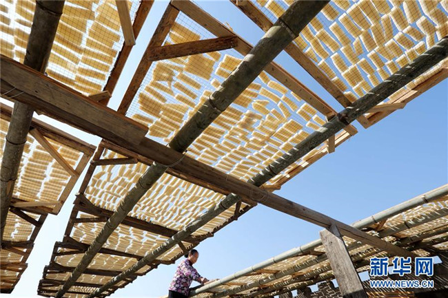 11月4日,在貴州省黎平縣中潮鎮(zhèn)佳所侗寨,村民在晾曬“侗果”粑塊。 近日,貴州省黔東南苗族侗族自治州黎平縣中潮鎮(zhèn)佳所侗寨的村民們搶抓晴好天氣,忙著制作、晾曬“侗果”,侗寨里一派忙碌。“侗果”是當?shù)囟弊逋捅貍涞奶厣朗?,是將蒸熟的糯米切成小粑塊后,再經(jīng)曬干、油炸、澆紅糖和上芝麻等工序制作而成。 新華社發(fā)(楊代富 攝