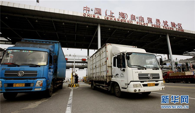 完成無紙化通關手續(xù)的卡車駛出位于上海外高橋的自貿區(qū)車輛出入口(2017年1月10日攝)。新華社記者方喆攝