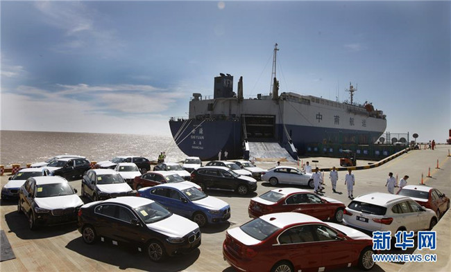在位于上海臨港新城的自貿區(qū)滾裝碼頭上,工作人員將卸下船的車輛開到碼頭指定停車場(2017年9月13日攝)。新華社記者方喆攝