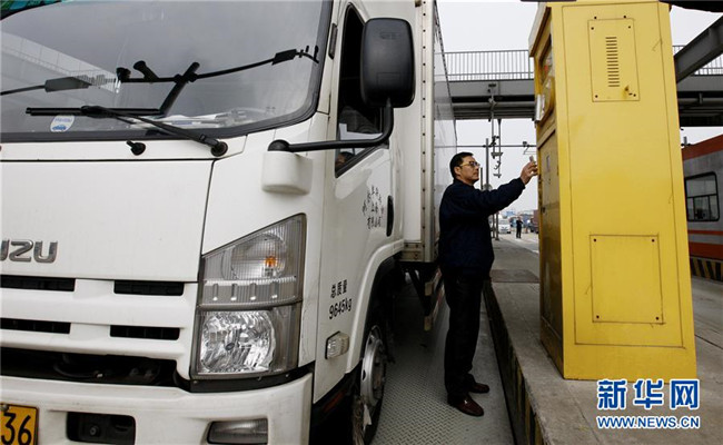一名卡車司機在上海外高橋的自貿區(qū)車輛出入口掃描手機二維碼完成通關手續(xù)(2017年1月10日攝)。新華社記者方喆攝