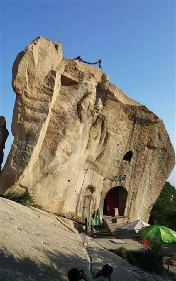 華山以石著名,每一處奇石都有一個美麗而動人的傳說。過了擦耳崖,看到的這兩塊石頭叫“日月巖”,左邊的代表“日”,右邊的代表“月”,上面這四個字是“云天弧光”,有時在夜晚,這里會出現(xiàn)一道非常耀眼的光。相傳武則天當(dāng)年上華山走這里,看到這兩塊形似日月的石頭,就別出心栽地給自個兒的字號創(chuàng)造了一個“瞾”字,因為這兩塊奇石上頂青天,下臨空谷,唯我獨尊,是光明與權(quán)威的象征。