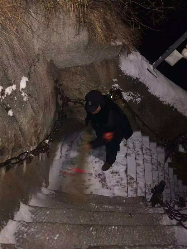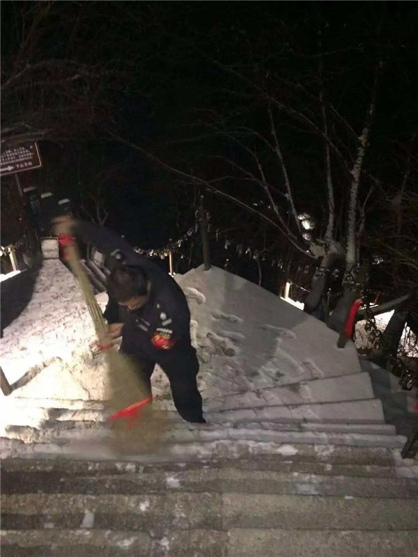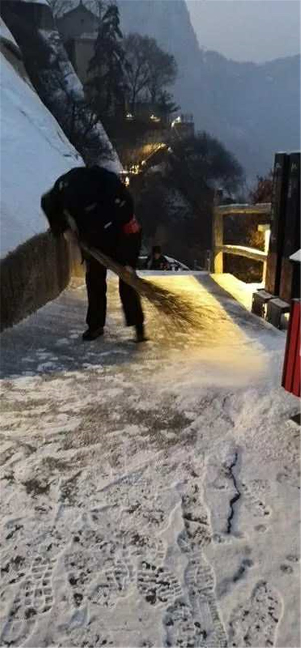 2019年元月4日,在小寒節(jié)氣到來之前,一場(chǎng)應(yīng)景的小雪降落在華山,華山主峰區(qū)的工作人員第一時(shí)間清掃積雪,為游客的安全保駕護(hù)航。