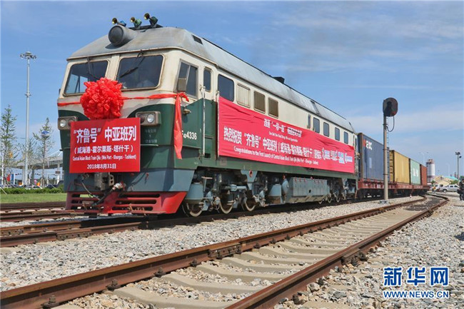 滿(mǎn)載貨物的“齊魯號(hào)”中亞班列從山東威海港出發(fā),駛往烏茲別克斯坦首都塔什干(2018年8月31日攝)。新華社發(fā)(唐克 攝)