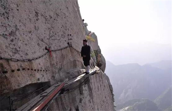 長空棧道位于南天門外,是華山著名險道之首。棧道分三段:南天門石坊至朝元洞西,路依崖鑿出,長20米,寬二尺許,為上段。折而下,崖隙橫貫鐵棍,形如凌空懸梯,游人須挽索逐級而下,稱之"雞下架",是為中段。再西折為下段,筑路者在峭壁上鑿出石孔,楔進(jìn)石樁,石樁之間架木椽三根,游人至此,須面壁貼腹,腳踏木椽橫向移動前行。長空棧道是華山險道中險中之險。