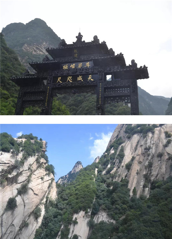 往西可去往中峰,往南可順原路返回,因暴雨如注,只得放棄攀爬中峰。順原路經(jīng)鷂子翻身,孩子仍念念不忘:“媽媽,這會(huì)兒大暴雨,肯定沒人排隊(duì),咱們?nèi)シ_子翻身!”聽了孩子“初生牛犢不畏虎”的話,我不由哈哈大笑:“小傻瓜!這么大的暴雨,有誰(shuí)去翻鷂子翻身呢?不要命啦?”在鷂子翻身入口處,孩子還是萬(wàn)般眷戀地探身查看,當(dāng)看到還未來得及撤離的人員身系保險(xiǎn)繩懸掛在峭壁上,就像風(fēng)雨中掉著蛛絲的蜘蛛,被風(fēng)雨襲擊的無處藏身、進(jìn)退兩難,方才知道了害怕。