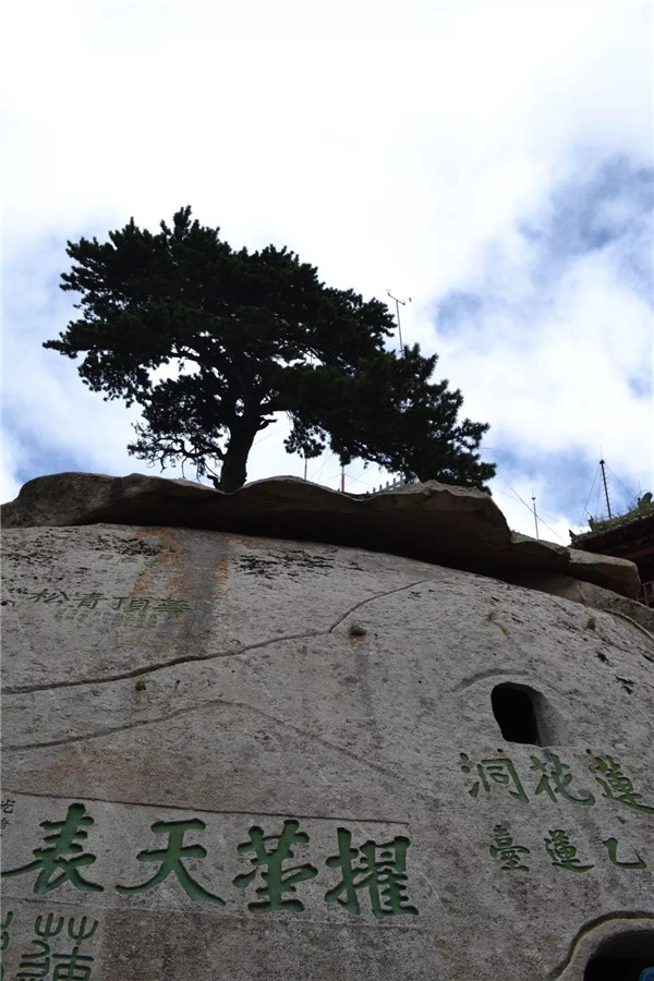小心謹(jǐn)慎通過青龍背,迎面一方碩大石體,石壁滿布?xì)v代石刻,頂端平坦,狀如蓮花,也許這就是西峰又名蓮花峰的由來吧!行不遠(yuǎn),有巨石懸于頭側(cè),原來這就是大名鼎鼎的斧劈石!孩子聽著我講沉血“劈山救母”的美麗傳說,對(duì)沉香手中的神斧產(chǎn)生了濃厚的興趣。那巨大的石頭,被神斧劈開,斷面整齊利落,就那么懸在山頂,好像一陣風(fēng)就能吹落。我拉著孩子快步通過斧劈石,總感覺巨石會(huì)從天而降!
