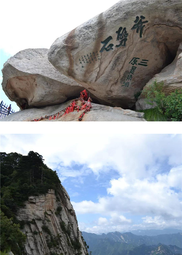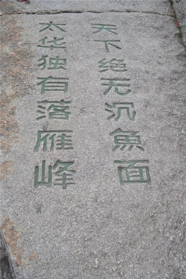 在南峰頂,孩子看到“天下絕無沉魚面,太華獨(dú)有落雁峰”的題刻,打趣我:“媽媽,你叫鴻雁,這里又叫落雁峰,真是和你有緣呢!快來這塊大石頭上落落腳,歇一歇!”“好?。≡蹅z都爬累了,都歇一歇!”我為孩子的體貼欣慰!