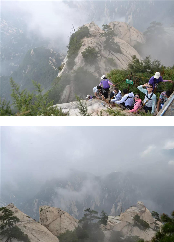 由西峰返回去往南峰,在青龍背上,斷崖側(cè)的云霧漸漸升騰上來,遠(yuǎn)處的山峰松柏,隱入云霧中。升騰上來的霧氣,彌漫到了眼前,眼睛、面龐也被霧氣濕潤(rùn)了。斷崖外的一切景致,已完全不見了蹤影,白霧茫茫,仙風(fēng)陣陣,人猶如騰云駕霧一般。孩子伸手去抓云霧,可云霧哪里是能抓到的。我們何其有幸?竟然不期而遇“云霧華山”的奇景!