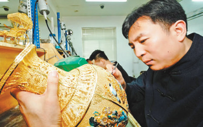 圖為獲得“北京大工匠”稱號的工藝美術(shù)大師陳令勇在進(jìn)行花絲鑲嵌。本報記者賀勇攝