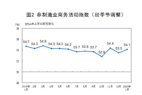 2020年1月份,非制造業(yè)商務(wù)活動指數(shù)為54.1%,比上月上升0.6個百分點,表明非制造業(yè)總體保持擴張。