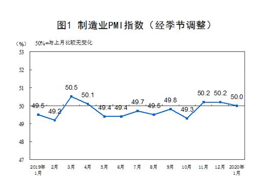 2020年1月份,中國制造業(yè)采購經(jīng)理指數(shù)(PMI)為50.0%,比上月小幅回落0.2個百分點。