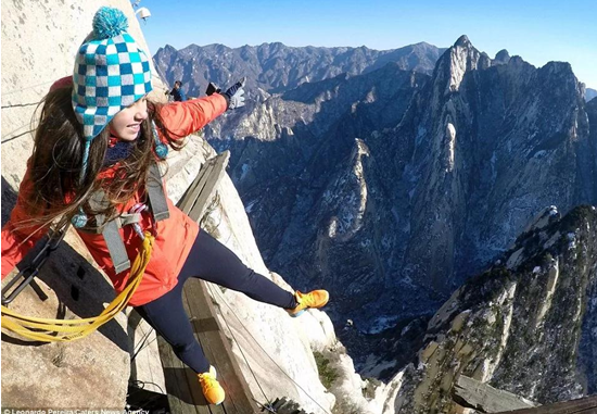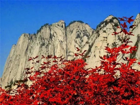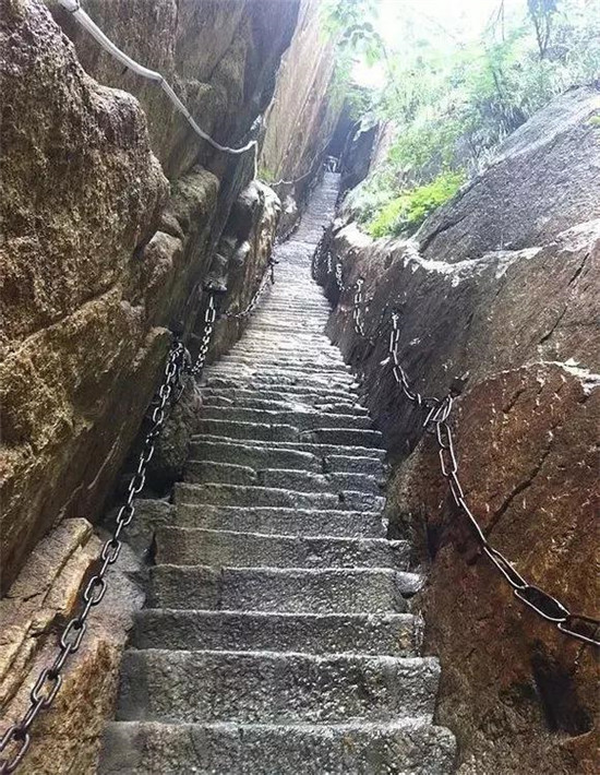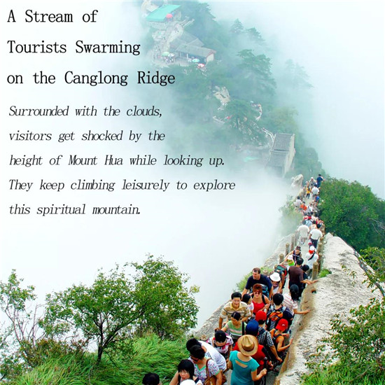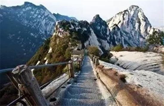 這是一個溫暖的美麗秋天,華山壯觀的峭壁在陽光下閃閃發(fā)亮,稀有樹木炫耀著多彩的秋葉,遠(yuǎn)方跳躍的瀑布吸引著游客的眼球,奇形怪狀的點點白云在腳下緩緩流動。我和我的朋友開始了一場艱苦的旅行,一起攀登6,600多級鑿在巖石上的臺階,目標(biāo)是海拔2154.9米南峰之巔祭祀華山神的道觀?! ?