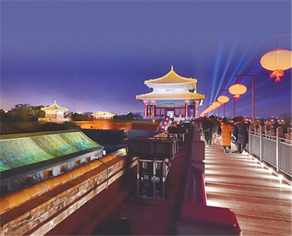 觀眾入場(chǎng)前,可觀賞午門(mén)城樓及東、西雁翅樓在燈光映照下的壯美雄姿。自午門(mén)入場(chǎng)后,首先觀賞點(diǎn)亮后的太和門(mén)廣場(chǎng),隨后由午門(mén)西馬道登午門(mén)城樓,參觀“紫禁城里過(guò)大年”展覽,在東雁翅樓欣賞中央民族樂(lè)團(tuán)琵琶演奏家趙聰及其團(tuán)隊(duì)的演奏。結(jié)束午門(mén)展廳參觀后,觀眾沿著由紅燈籠點(diǎn)綴的城墻步行至東南角樓,觀看虛擬現(xiàn)實(shí)影片《角樓》,隨后來(lái)到東華門(mén)城樓,參觀“營(yíng)造之道——紫禁城建筑藝術(shù)展”。當(dāng)走過(guò)近千米長(zhǎng)的布滿(mǎn)紅燈籠的故宮東城墻時(shí),可以看到臨近城墻西側(cè)的部分古建筑也被點(diǎn)亮,聆聽(tīng)暢音閣戲樓傳來(lái)的戲曲聲。到達(dá)東北角樓后,觀眾步行至神武門(mén),在這一區(qū)域可以觀賞到城墻南北兩側(cè)通過(guò)藝術(shù)燈光投影于建筑屋頂上的《千里江山圖》等作品,從而產(chǎn)生人在畫(huà)中游的感覺(jué)。離開(kāi)神武門(mén)城樓后,神武門(mén)外東、西兩側(cè)的角樓餐廳和角樓咖啡靜候光臨,從而結(jié)束此次“上元之夜”文化活動(dòng)。