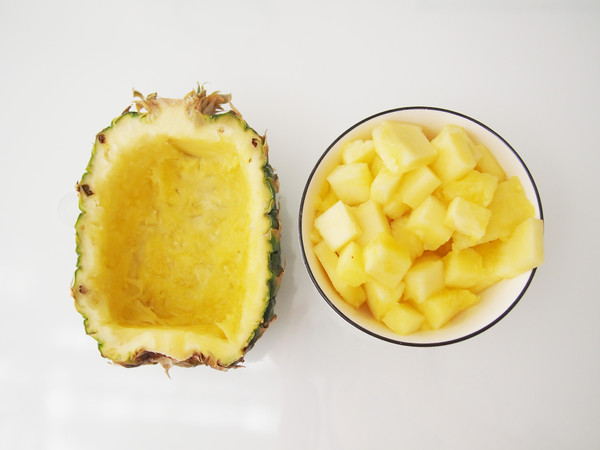 5.等待蒸米飯的時(shí)候,準(zhǔn)備其他食材。將菠蘿果肉挖出來,切成丁
