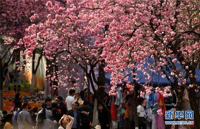 游人在昆明圓通山公園觀賞盛開的櫻花(3月16日攝)。新華社記者 秦晴 攝