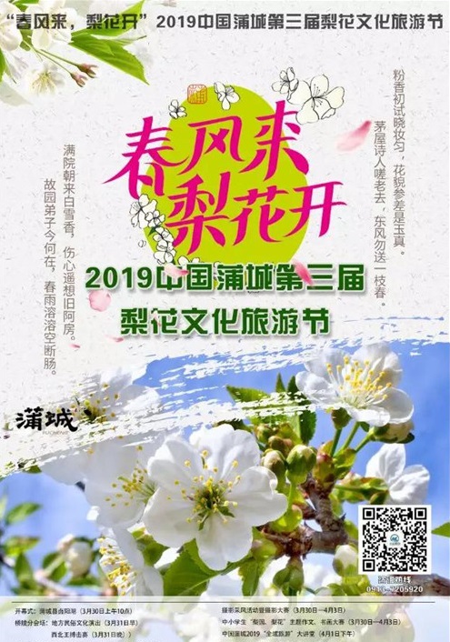 蒲城是國家農(nóng)業(yè)部命名的“中國酥梨之鄉(xiāng)”,是國內(nèi)外專家公認的"世界優(yōu)等酥梨最佳生態(tài)區(qū)"。本次活動以“梨花”為媒介,通過系列文化體驗活動的舉辦,讓蒲城文化走出去,以帶動區(qū)域旅游經(jīng)濟的發(fā)展。本屆梨花文化旅游節(jié)由陜西華山旅游集團蒲城有限公司、蒲城縣旅游建設投資有限公司主辦,蒲城縣委宣傳部、政府辦、文化和旅游局、公安局、農(nóng)業(yè)農(nóng)村局、果業(yè)局、交通局、商務局、應急管理局、市場監(jiān)督管理局、教育局、信訪局、電力局、交警大隊、電視臺、體育中心、孫鎮(zhèn)政府、橋陵鎮(zhèn)政府、陳莊鎮(zhèn)政府、椿林鎮(zhèn)政府、橋陵景區(qū)、清代考院博物館、惠陵景區(qū)、楊虎城將軍紀念館等單位協(xié)辦, 以“賞萬頃梨花 游將相故里 咥蒲城美味”為主題,3月30至4月3日在陜西蒲城縣舉行。