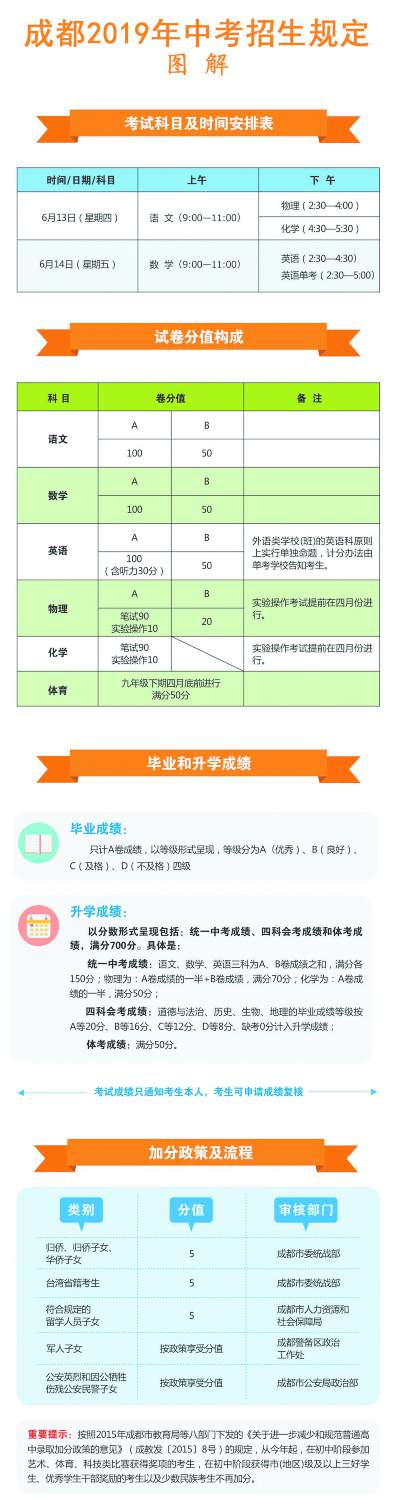 今年中考考試時(shí)間與往年一樣,為6月13日、14日,考試科目和計(jì)分辦法均未作調(diào)整。也即是說,今年中考統(tǒng)一考試科目依然為語文、數(shù)學(xué)、英語、物理、化學(xué)、體育六科。其中,物理、化學(xué)包括實(shí)驗(yàn)操作考試。體育考試以及物理、化學(xué)實(shí)驗(yàn)操作考試在九年級下期4月底以前,由各區(qū)(市)縣組織進(jìn)行。九年級結(jié)束時(shí),語、數(shù)、英、物、化五科的畢業(yè)考試與升學(xué)考試一并進(jìn)行,各科筆試考試均為閉卷考試,具體時(shí)間安排詳見圖解。其中,外語類學(xué)校(班),如成外實(shí)外等校的英語科,原則上單獨(dú)命題,統(tǒng)一考試。