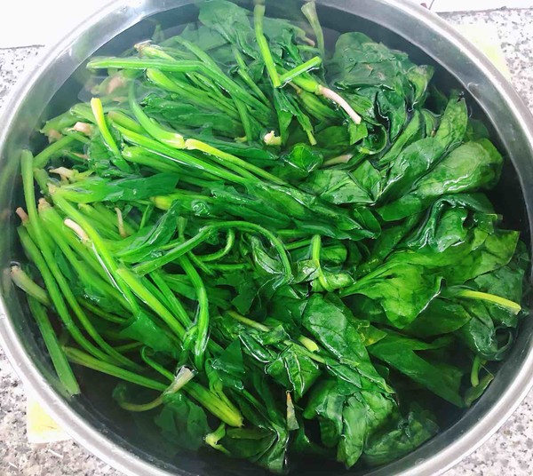 2.鍋中燒開(kāi)水放入菠菜焯水至菠菜剛剛變色即可時(shí)間不可過(guò)長(zhǎng)