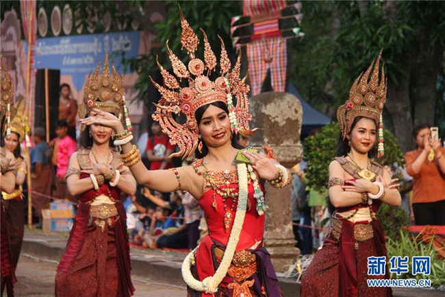 4月5日,在泰國武里南府,當?shù)嘏源虬绯上膳臉幼釉谂羶z隆寺前跳舞。新華社記者 楊舟 攝