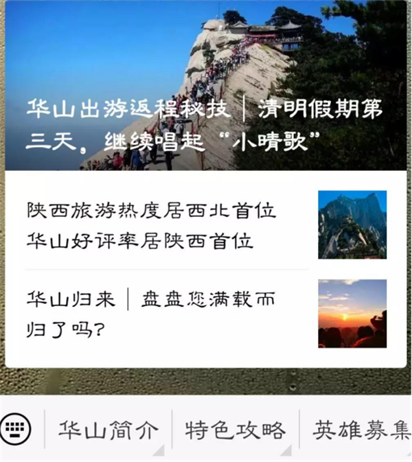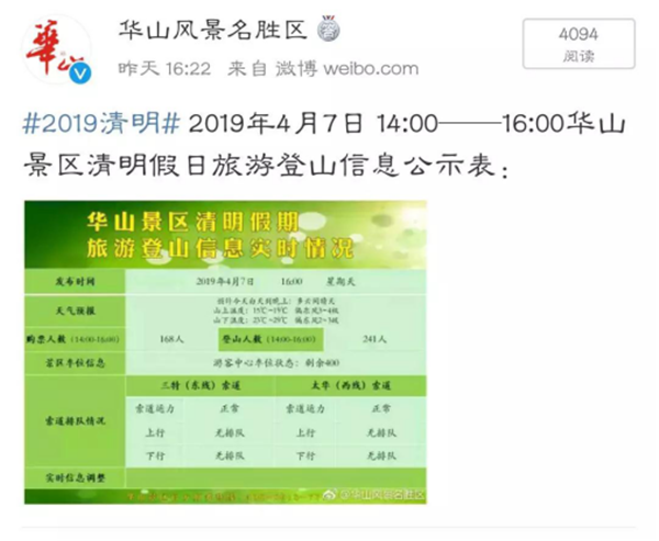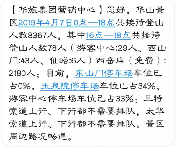 景區(qū)節(jié)日期間通過電子大屏、官方微博、微信、短信平臺(tái)向游客和各單位提供實(shí)時(shí)登山排隊(duì)人數(shù)、車位、天氣等信息。(小長假期間新浪微博共計(jì)發(fā)送微博48條,網(wǎng)友留言及回復(fù)361條,閱讀量共計(jì)421446余次;微信公眾平臺(tái)共計(jì)發(fā)送18篇軟文報(bào)道,分享及轉(zhuǎn)發(fā)量共計(jì)1098次,閱讀量共計(jì)10272次;短信平臺(tái)共計(jì)發(fā)送2394條短信,及時(shí)匯報(bào)各項(xiàng)旅游信息)。