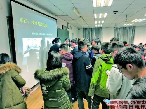 周四晚上7點,武漢大學教5樓的404教室,前門開著,有幾個學生站到了走廊里,頭朝教室里面看著;后門也開著,卻也被幾個站著的學生堵上了。從走廊踮腳往里看,教室四周站了一圈學生,手里捧著筆記本;過道里也坐著學生,抱著書包,聚精會神地看向黑板。