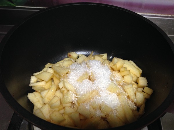 6.倒入少許水淀粉收汁冷卻備用,加入水淀粉可以讓蘋果丁口感會更綿滑