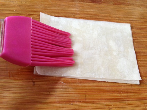 7.取一張餛飩皮刷滿黃油再放一張餛飩皮刷黃油直到放上第三張成一組,表面不刷黃油