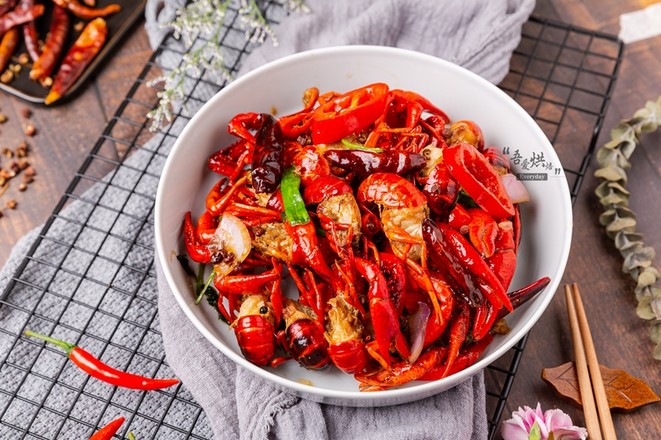 5.把清洗干凈的小龍蝦放入鍋中和紅油爆炒至變色。