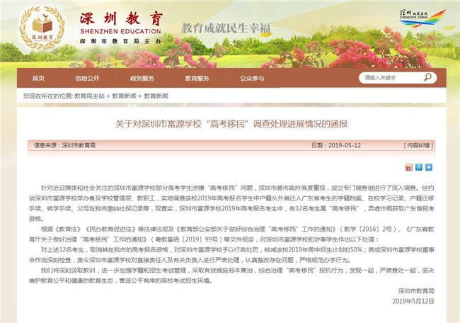 深圳市教育局網(wǎng)站12日發(fā)布《關(guān)于對(duì)深圳市富源學(xué)校“高考移民”調(diào)查處理進(jìn)展情況的通報(bào)》(以下簡(jiǎn)稱《通報(bào)》)?!锻▓?bào)》指出:經(jīng)查實(shí),深圳市富源學(xué)校2019年高考報(bào)名考生中,有32名考生屬“高考移民”,弄虛作假獲取廣東省報(bào)考資格。將取消此32名考生在深圳市的高考報(bào)名資格。
