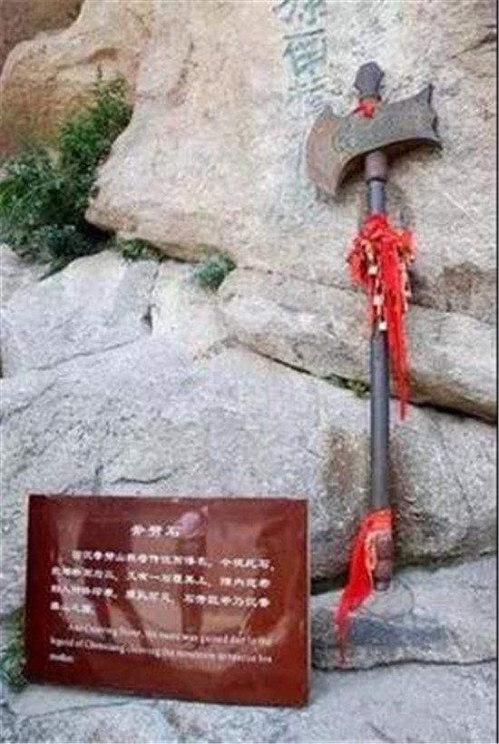 華山西峰就是《寶蓮燈》中沉香劈山救出三圣母的地方。翠云宮旁有一名為“斧劈石”的巨石,中間裂開,如同被斧劈開,旁邊還立著一柄長(zhǎng)把大斧。據(jù)說是當(dāng)年沉香救母使用的神兵。