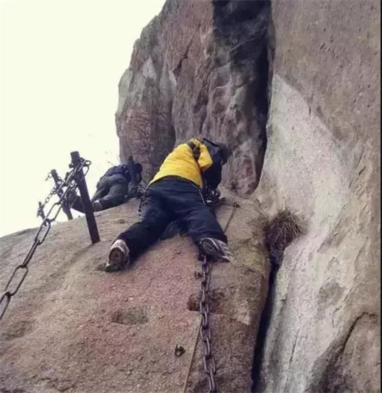 具有700多年歷史的長(zhǎng)空棧道,在華山南峰東側(cè)山腰的萬仞絕壁上。鑿出來的幾個(gè)踏腳之處,鑲嵌石釘搭木椽搭建了一個(gè)百余米懸空的棧道,讓人望而卻步。如果你有恐高癥,僅僅看一眼都會(huì)讓你心驚膽戰(zhàn)。2013年,著名旅游網(wǎng)站“Smarter Travel”盤點(diǎn)全球最恐怖懸崖步道,將華山長(zhǎng)空棧道列為全球十大最恐怖的懸崖步道之一。