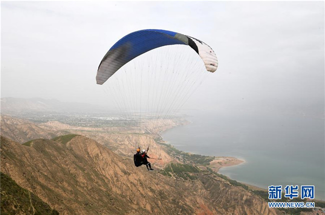 在永靖縣境內(nèi)的黃河三峽,游客體驗高空滑翔傘(5月19日攝)。 坐落于甘肅省永靖縣境內(nèi)的黃河三峽,由炳靈峽、劉家峽、鹽鍋峽組成,屬黃河上游。黃河三峽兩岸人文景觀豐富,自然風光秀美。 新華社記者 范培珅 攝