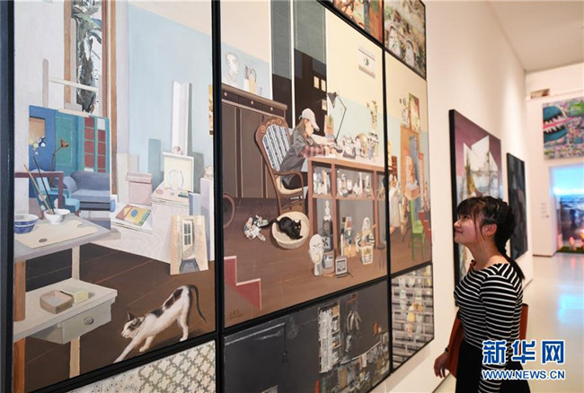 5月24日,觀眾在畢業(yè)生作品展上參觀油畫作品《陪伴》系列。