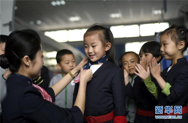 當(dāng)日,蘭州惠智博仁幼兒園的小朋友在東航甘肅分公司空乘人員的陪伴下來(lái)到蘭州文理學(xué)院,體驗(yàn)客艙安全檢查、服務(wù)禮儀示范等內(nèi)容,迎接即將到來(lái)的“六一”兒童節(jié)。新華社記者 王朋 攝