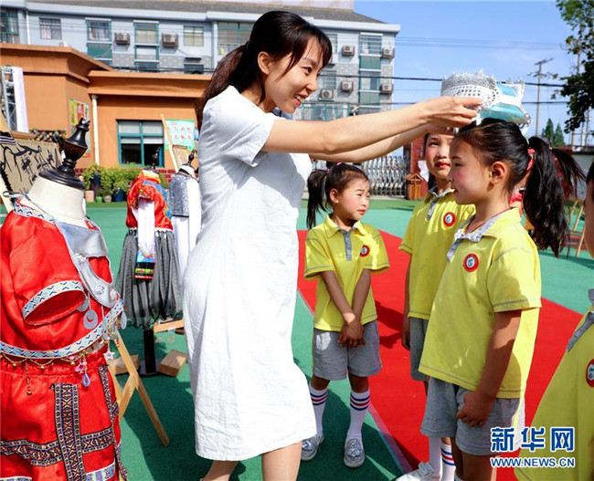 5月28日,老師帶領(lǐng)孩子們認(rèn)識不同民族的服飾。