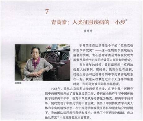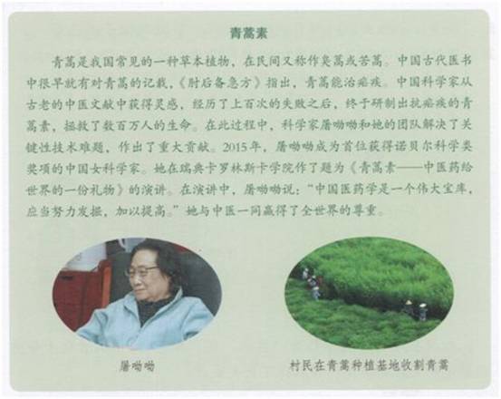 此外,初中歷史教材也在《中國(guó)歷史》八年級(jí)下冊(cè)第18課“科技文化成就”中,對(duì)屠呦呦科研團(tuán)隊(duì)先進(jìn)事跡進(jìn)行了專(zhuān)題介紹。