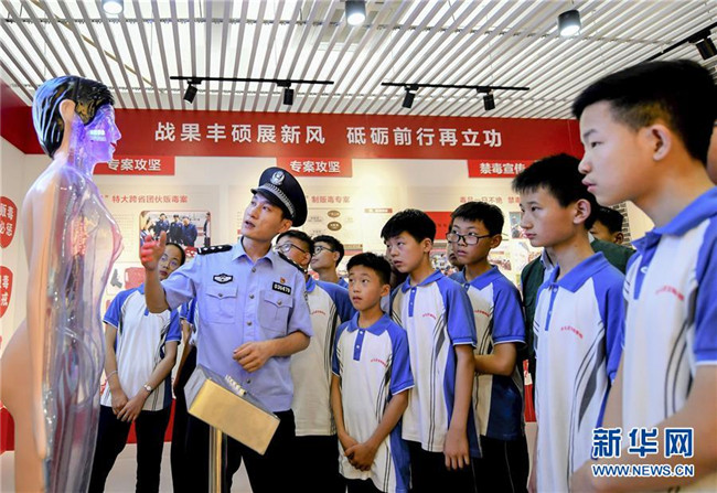 6月26日,在山東省棗莊市臺兒莊古城中學(xué)的禁毒教育基地,民警向?qū)W生介紹新型毒品的種類、特征和危害。新華社發(fā)(高啟民攝)