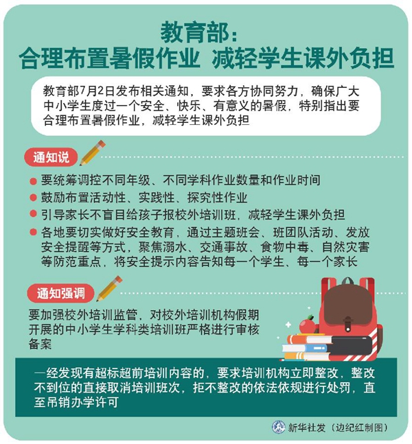 暑假將至,教育部2日發(fā)布相關(guān)通知,要求各方協(xié)同努力,確保廣大中小學(xué)生度過一個安全、快樂、有意義的暑假,特別指出要合理布置暑假作業(yè),減輕學(xué)生課外負(fù)擔(dān)。