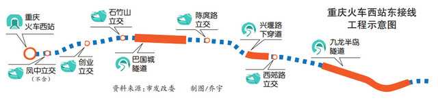 重慶日報記者7月2日獲悉,市發(fā)展改革委近日正式批復(fù)了重慶火車西站東接線工程可行性研究報告。項目全長9.4公里,呈東西走向,總投資約74.9億元,建成后將緩解重慶西站對外的交通壓力。